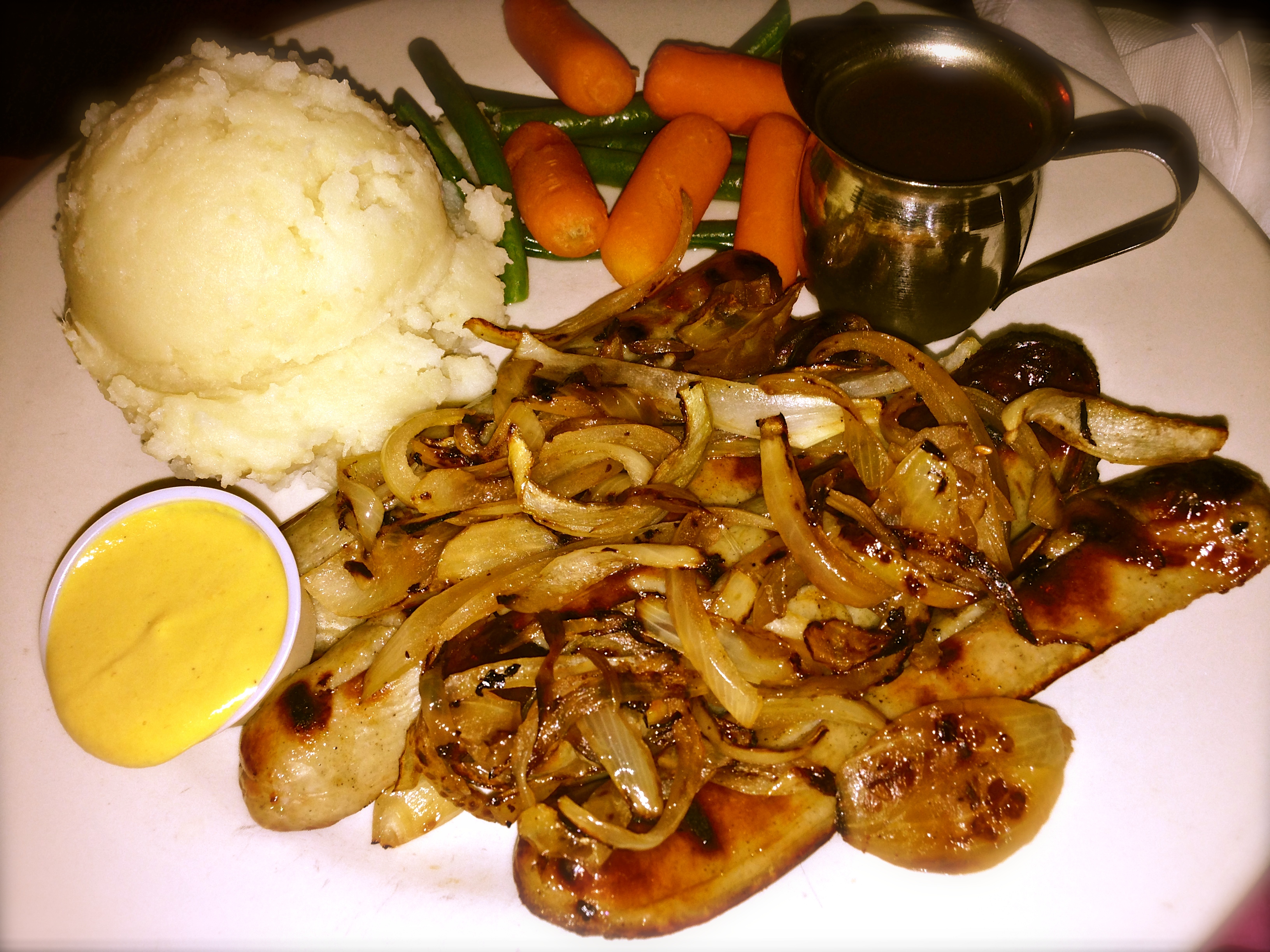 Do you like pub food? Who doesn’t… well, unless you are a vegetarian, or gluten free… perhaps not that many options for you, but if you aren’t watching your diet and you don’t mind eating meat products, Britannia Arms has a “bangers and mash” dish that you need to try. Two mild pork sausages topped with grilled onions served with a side of mashed potatoes, steamed veggies, gravy and a spicy mustard sauce. Make sure you tell them to “butterfly” the sausage, which means that they will spit the sausage in half and grill it on both sides leaving a nice “crunch” to the sausage, you’re welcome. Eat that, run later.