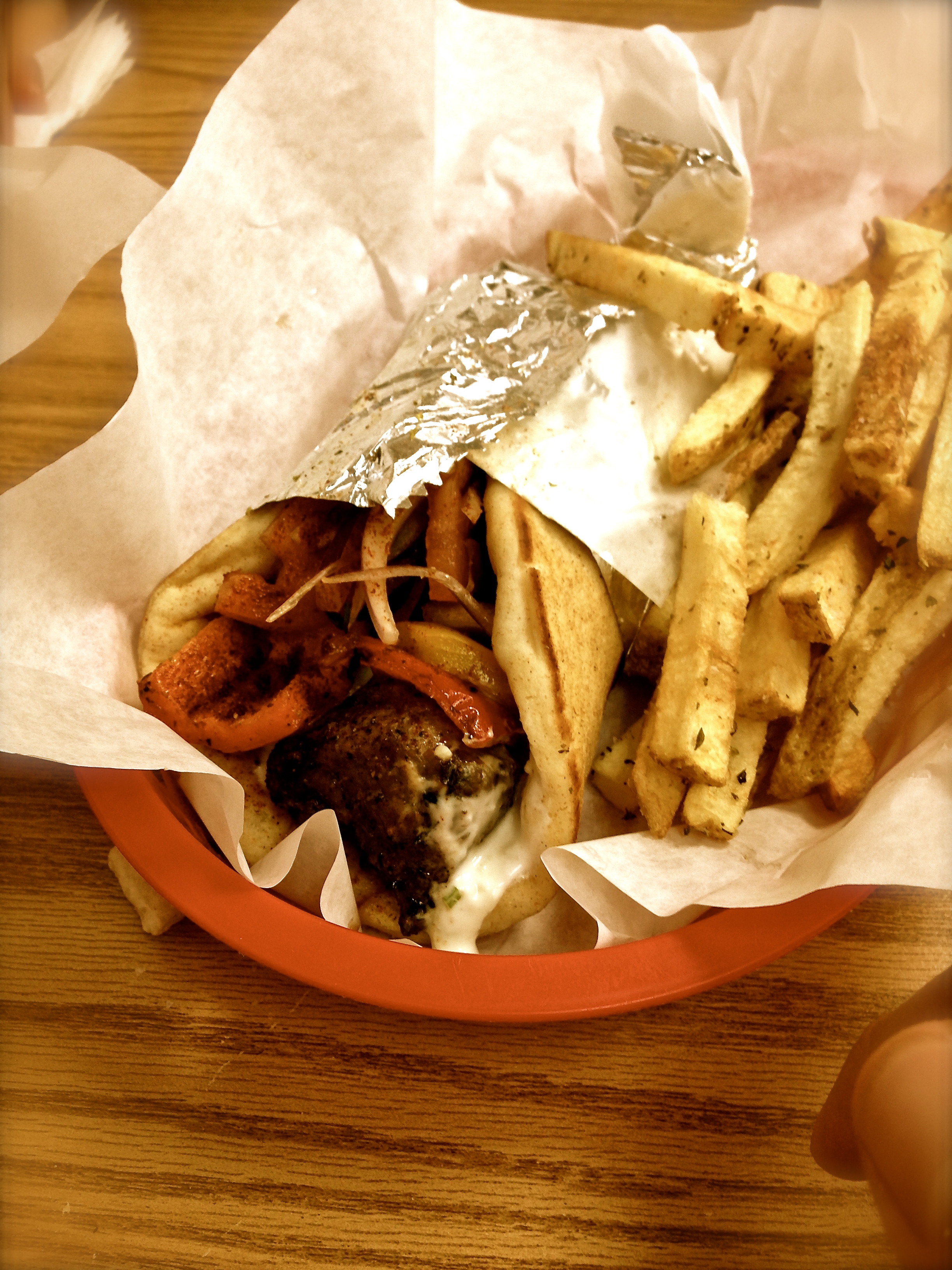 seasoned and toasted pita with a spicy feta dipping sauce (also good for dipping fries), and then a souvlaki filled with your choice of perfectly cooked lamb, chicken or beef with peppers and a delicious tzatziki sauce, with a side of seasoned fries all for about $10, amazing! I’ve been to other Greek restaurants where you would pay at least twice that amount for the same thing! Do your taste buds a favor and check this place out, Souvlaki Greek Skewers.