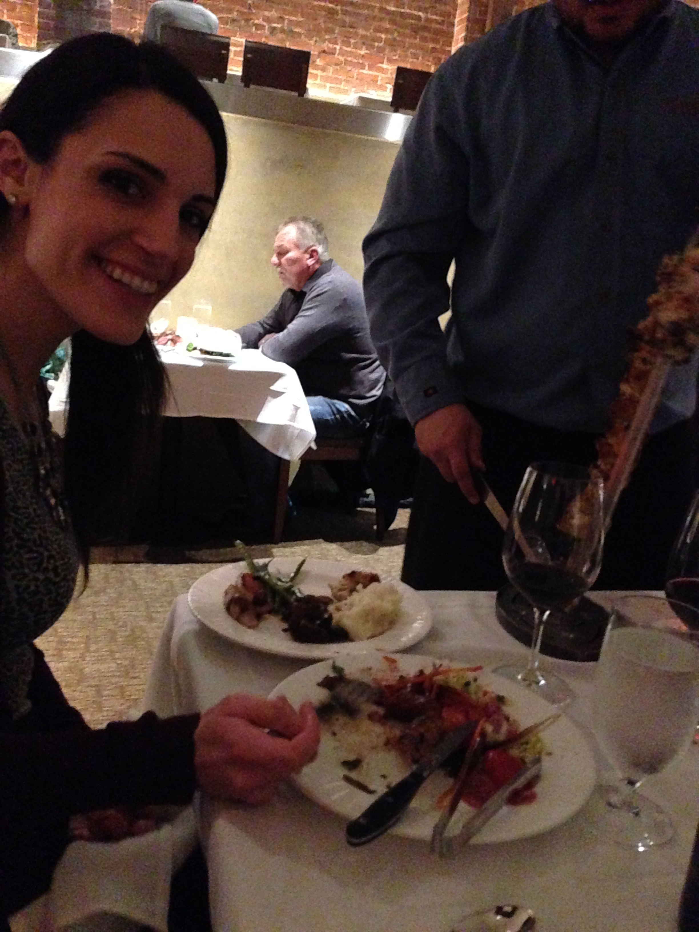To add to our list of amazing friends and amazing restaurants, tonight we went to Pampas which is a Brazilian steakhouse. If you are unfamiliar with the Brazilian steakhouse, you are invited to an amazing buffet spread of salads, potatoes, olives, cheeses, cold meats, and side dishes to compliment the skewers of 16 kinds of meats that will come endlessly to your table. Word of advice: pace yourself and skip the cheezy bread. I can’t even name all the meats we tried but just to give you an idea: