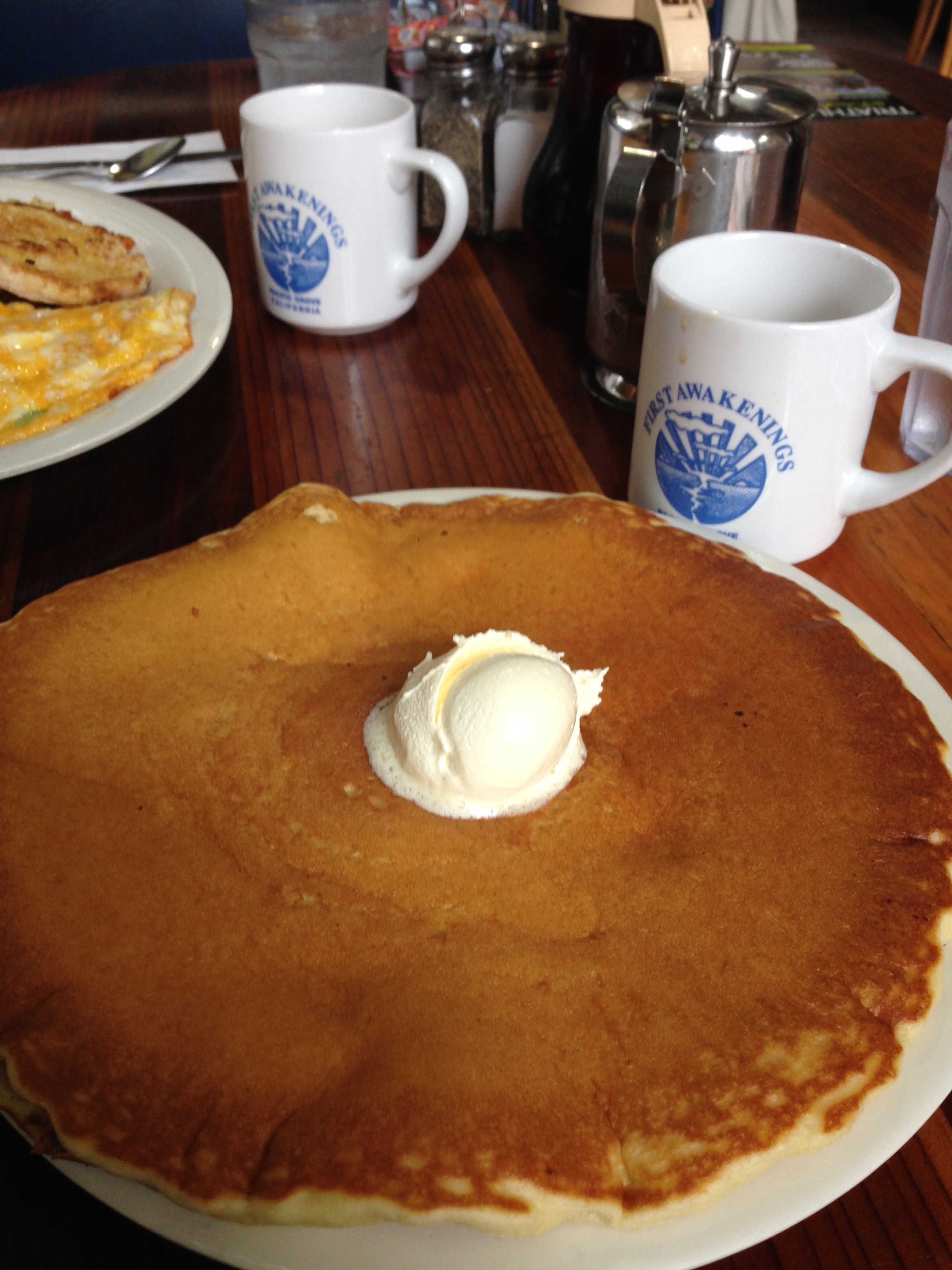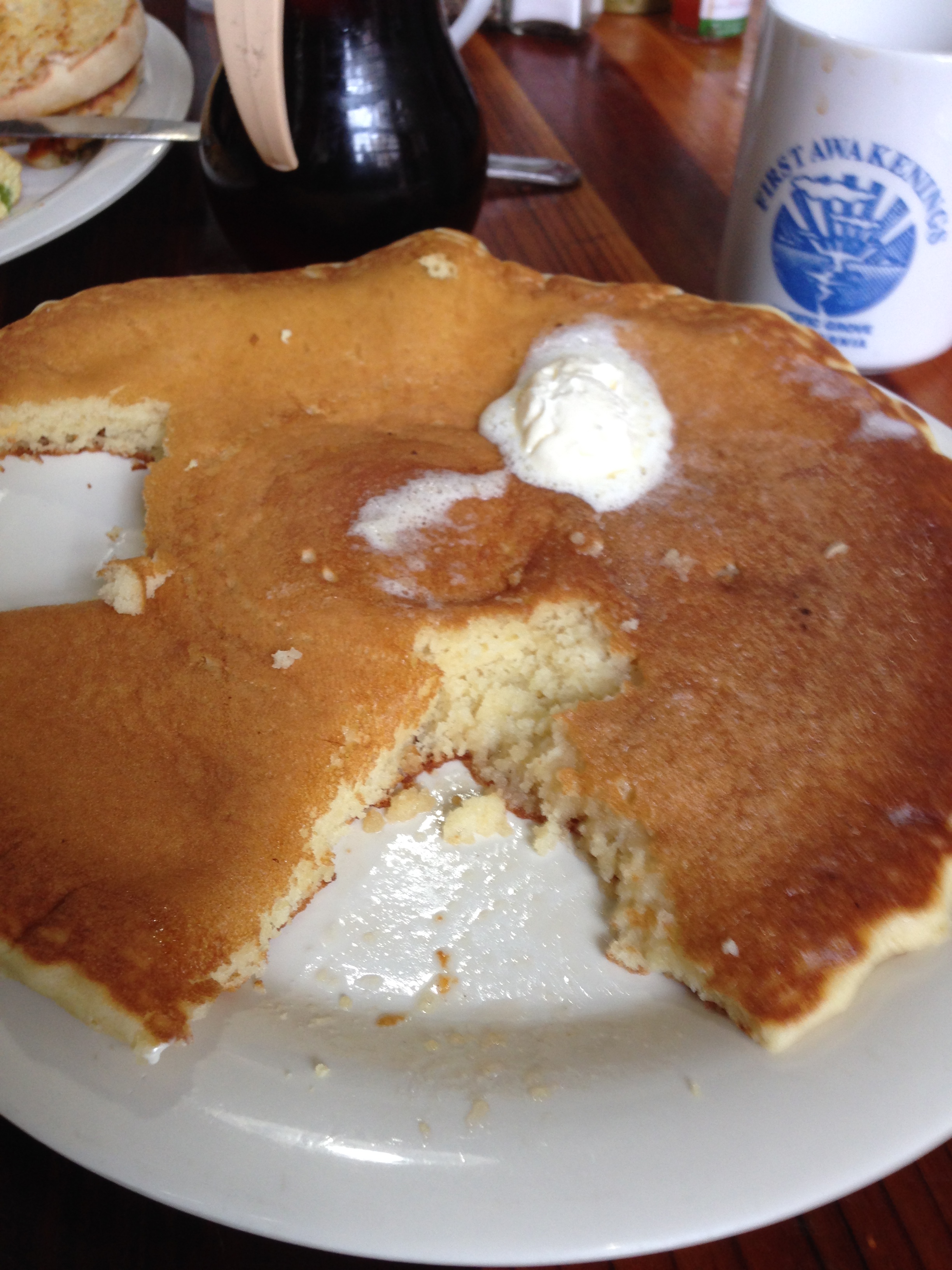 Before our ride home we had breakfast at First Awakenings in Pacific Grove, where the pancake I had was ginormous. In picture below you can see how big the pancake was, and how much I actually ate of it…