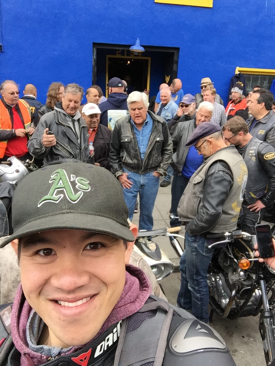 IMG_2291A few weeks ago my motorcycle club was invited to be apart of a pilot episode for Jay Leno’s new show, “Jay Leno’s Garage.” This episode featured the San Francisco Motorcycle Club which apparently is one of the oldest in the country turning 111 years old this year. The producers wanted to shoot Jay riding around San Francisco with other motorcycle enthusiasts following an interview with the club president. How often does one have the opportunity to ride motorcycles with Jay Leno through San Francisco? So taking the advice of my boss and pastor, I was feeling good and put in for a sick day. So on a random Tuesday, my friend Brian and I rode to San Francisco to join some friends for breakfast at Red’s Java House right underneath the Bay Bridge before heading over to the club where hundreds of bikers and motorcycle enthusiasts gathered to ride with Jay Leno. When we got to the club I had to use the restroom and walked in the middle of their shoot. Seizing the opportunity, I asked Jay if he would take a picture with me and he actually said, “yes”. I could not believe it! Jay was wearing his classic denim on denim and I will just say, there is a reason why he rides with an open face helmet. It was a “sick day” well spent.