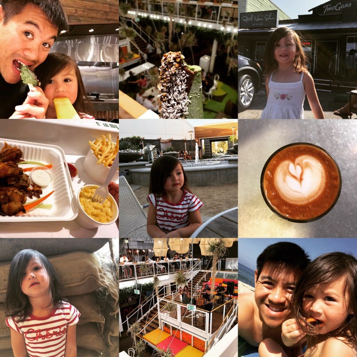 Between sitting on the beach and driving the city, Evangeline and I went on our own post-gastrectomy food tour sampling the finest coffee roasters the Southland has to offer paired with some delicious toddler-approved fare. Our first stop was at a Japanese-American fusion burger joint called the Humble Potato known for their version of the American classic which they call the hambága. Since I no longer eat red meat, I decided to go with the Tempeh with Karê which is an Indonesian soy patty chopped up with an Indian tasting spice/curry over slaw with a fried egg on top. Do I miss eating burgers? Absolutely, but living in California means there will always be plenty of options. For those who know me, food tours are incomplete without visiting new coffee shops. Before getting off the plane I knew I needed to pay homage to the place that combines my two passions: motorcycles and coffee, Deus Ex Machina in Venice Beach.
