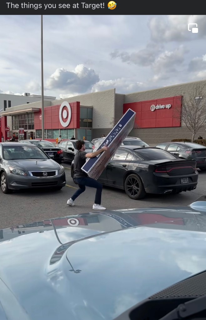 In my Facebook algorithm, a video popped up about “things you see at Target”. The original creator, Quint Essential, posted a video of a person who bought a big flat-screen TV, but clearly did not have a plan to transport it home. After watching the individual struggle to put the TV in the trunk, then back up the car to slide it into the back seat only to realize it would not fit through the door, the person filming the video steps out to ask if he needed help.